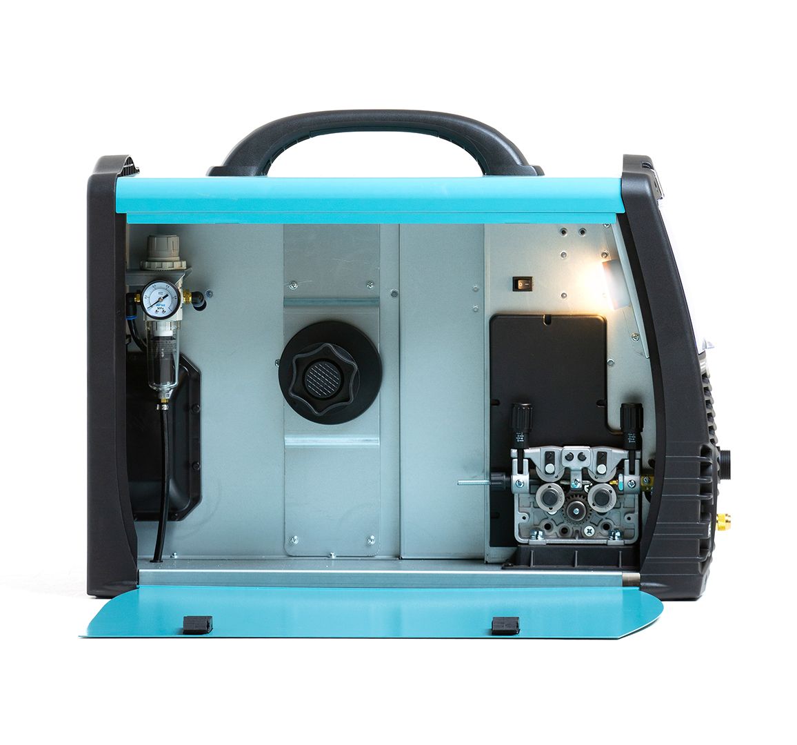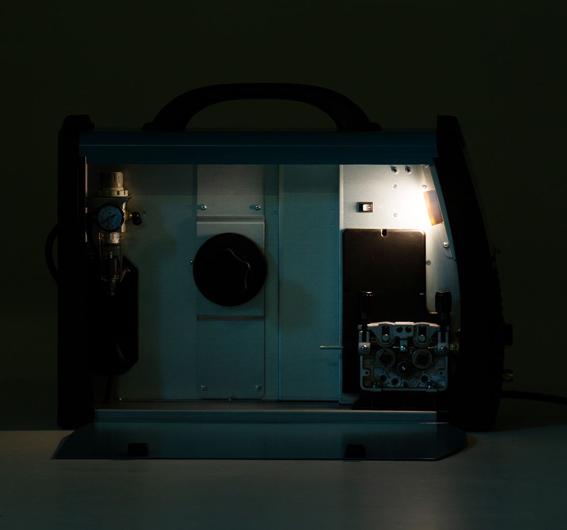 Аппарат позволяет устанавливать 5-ти и 18-ти килограммовую катушку проволоки. Установлен 4-х роликовый надежный и мощный подающий механизм.