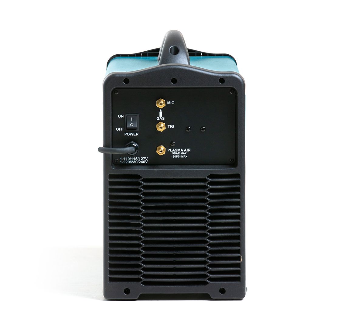 На задней крышке три 6ти миллиметровых штуцера для быстросъёмного подключения газа и воздуха (внутри аппарата установлено 3 отдельных газовых клапана, для MIG ,TIG сварки и CUT резки, что очень удобно так как к аппарату одновременно может быть подключено сразу газ для MIG сварки, газ для TIG сварки и СUT резки ).