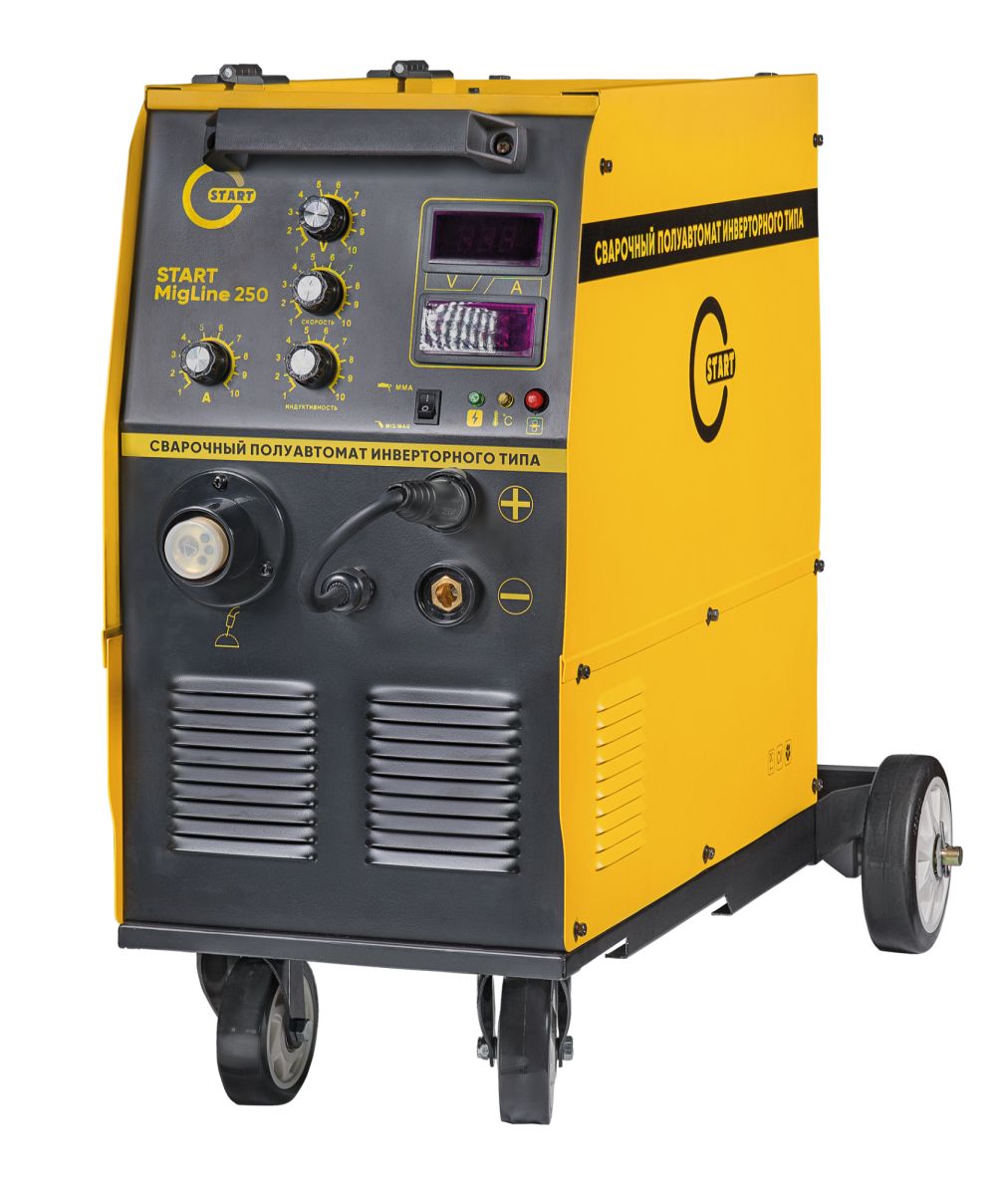Сварочный полуавтомат инверторного типа START MigLine 250 - мощный и надежный, выполнен в специальном корпусе на передвижной тележке с возможностью легкой транспортировки данного аппарата, предназначенный для полуавтоматической сварки в среде защитных газов (MIG/MAG) и ручной дуговой сварки MMA.