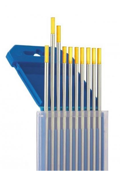 Вольфрамовые электроды WL-15 диаметром 1,6 мм - лантанированный вольфрам (цветовой признак - золотистый цвет). Применяется при сварке на переменном и постоянном токе, химическое соединение LaO2, содержание окисной добавки - 1,2-1,8%. Электроды из сплава вольфрама с оксидом лантана имеют очень легкий первоначальный запуск дуги, низкую склонность к прожогам, устойчивую дугу и отличную характеристику повторного зажигания дуги. Добавление 1,5% оксида лантана увеличивает максимальный ток, несущая способность электрода примерно на 50% больше для данного типоразмера при сварке на переменном токе, чем чисто вольфрамового. По сравнению с цериевыми и ториевыми, лантановые электроды имеют меньший износ рабочего конца электрода. Лантановые электроды более долговечны и меньше загрязняют вольфрамом сварной шов. Оксид лантана равномерно распределен по длине электрода, что позволяет длительное время сохранять при сварке первоначальную заточку электрода. Это серьезное преимущество при сварке на постоянном (прямой полярност