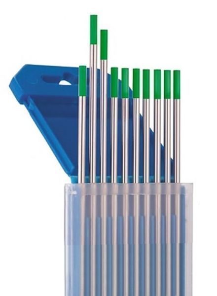 Вольфрамовые электроды WP диаметром 1,6 мм - чисто вольфрамовый электрод (цветовой признак – зеленый цвет) с содержанием вольфрама не менее 99,5%. Используется предпочтительно для сварки на переменном синусоидальном токе, обеспечивает хорошую устойчивость дуги как в аргоновой, так и в гелиевой среде. Из-за ограниченной тепловой нагрузки рабочий конец электрода из чистого вольфрама формируют в виде шарика. Основные свариваемые материалы: алюминий, магний и их сплавы.