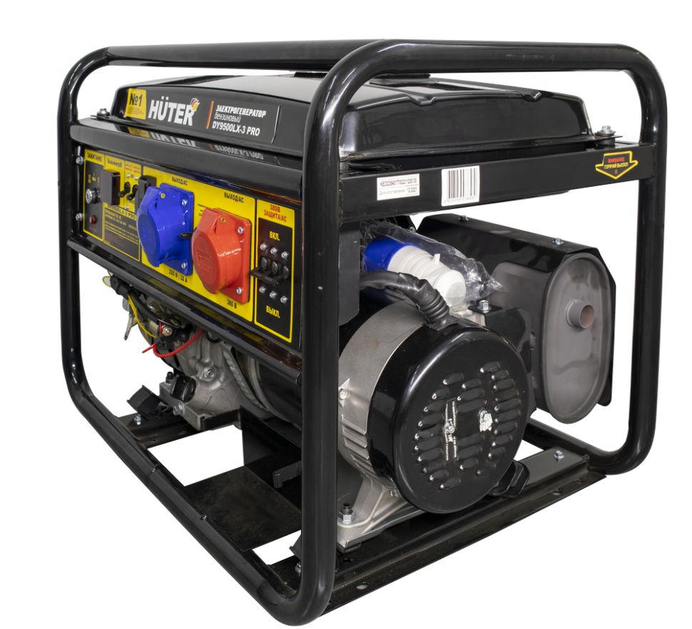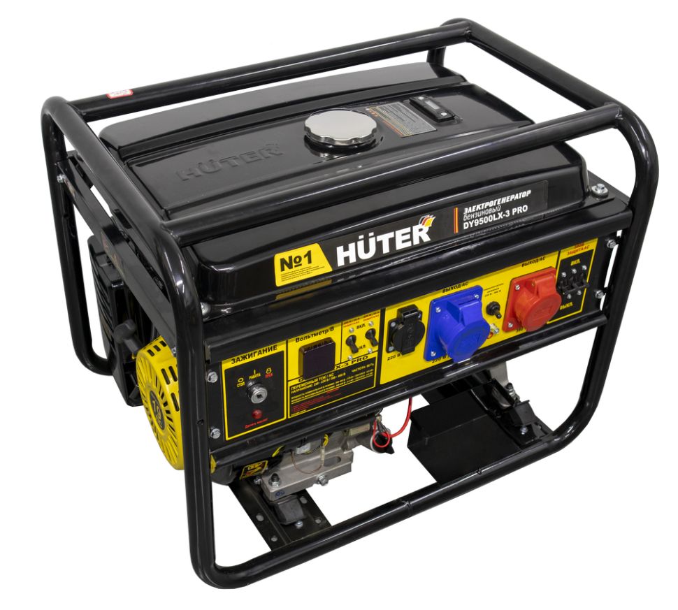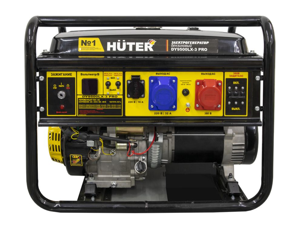 Бензиновый генератор Huter DY9500LX-3 PRO – портативная компактная электростанция, обеспечивающая электроснабжение бытовой техники и профессионального оборудования, питающегося от стандартной сети 220, а также 380 Вольт. Это самый выгодный бензиновый электрогенератор, с оптимальными техническими характеристиками и низким расходом топлива.Модель DY9500LX-3 PRO может использоваться в качестве резервного источника питания для частных домов и квартир, а также как постоянная станция, обеспечивающая работу электроприборов в полевых условиях. Генерирующая установка имеет синхронный тип устройства и щёточный механизм.Комплектация:Бензиновый электрогенератор.Силовая вилка 32 АСвечной ключ. Вороток либо отвёртка (в зависимости от модели)Провода и детали лотка аккумуляторной батареи (для моделей с X в названии)Комплект резиновых опор с гайкамиКлюч электростартера (для моделей с обозначением X)Паспорт (руководство по эксплуатации)Бензиновая электростанция Huter DY9500LX-3 PRO оборудована мощным одноцилиндровым четырёхтактным двигателем внутреннего сгорания, мощностью 19 л.с. Запуск производится ручным стартером или электростартером от АКБ (*аккумулятор не входит в комплектацию и приобретается отдельно). Для удобства транспортировки, отдельно можно приобрести колёса и ручки. Электрогенератор DY9500LX-3 PRO имеет рабочую мощность 6.8 кВт в режиме 220 Вольт и 7.8 кВт в режиме 380 Вольт, а также все виды защиты – от перегрузки, короткого замыкания и низкого масляного уровня.