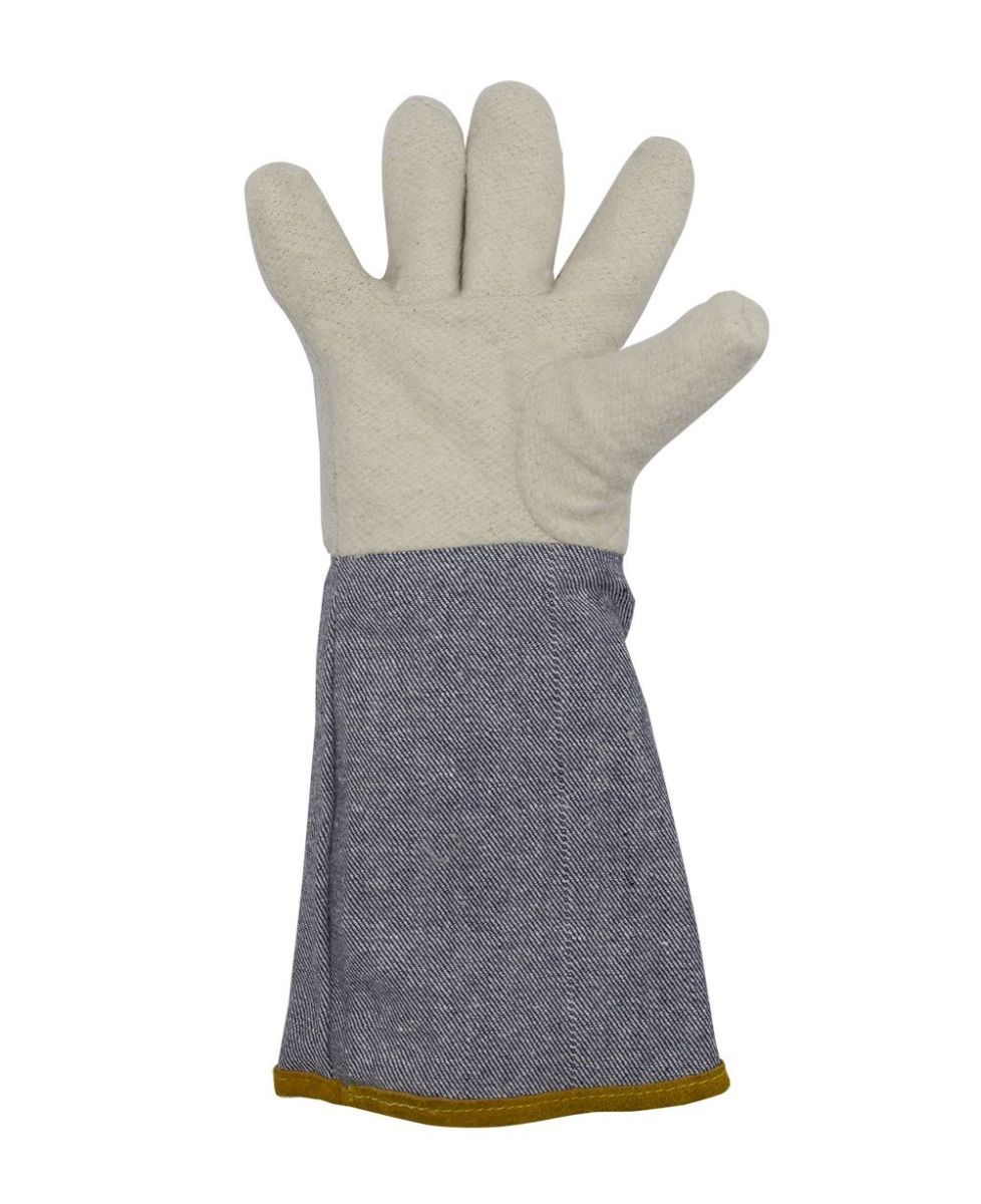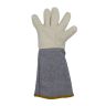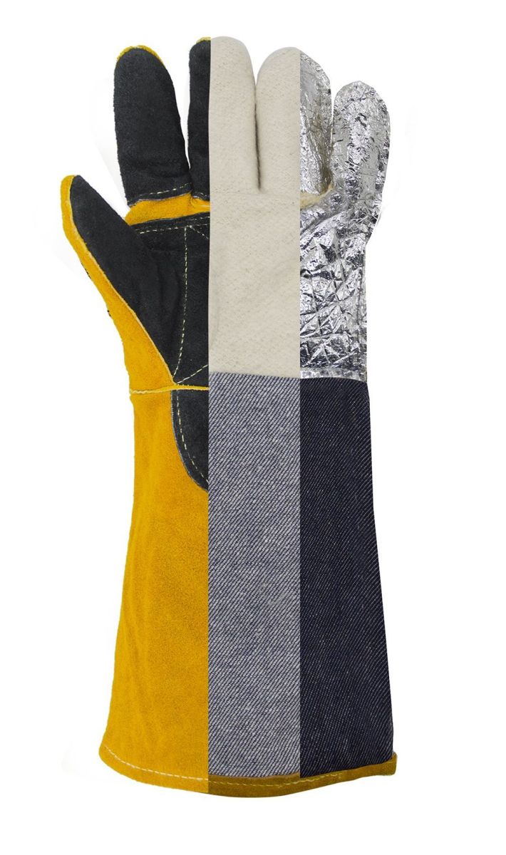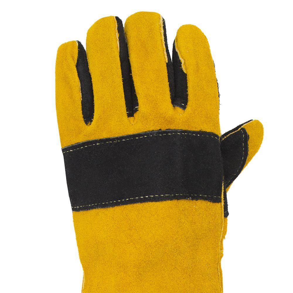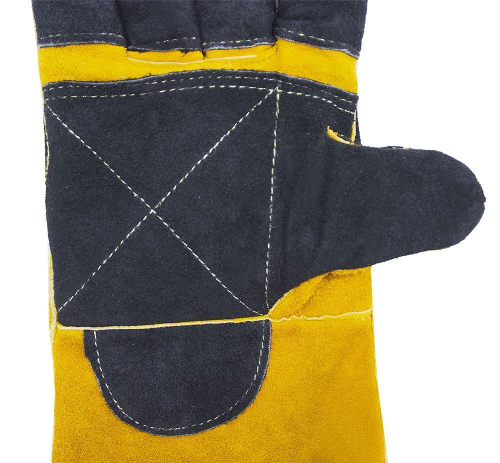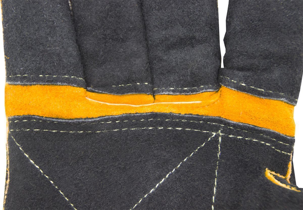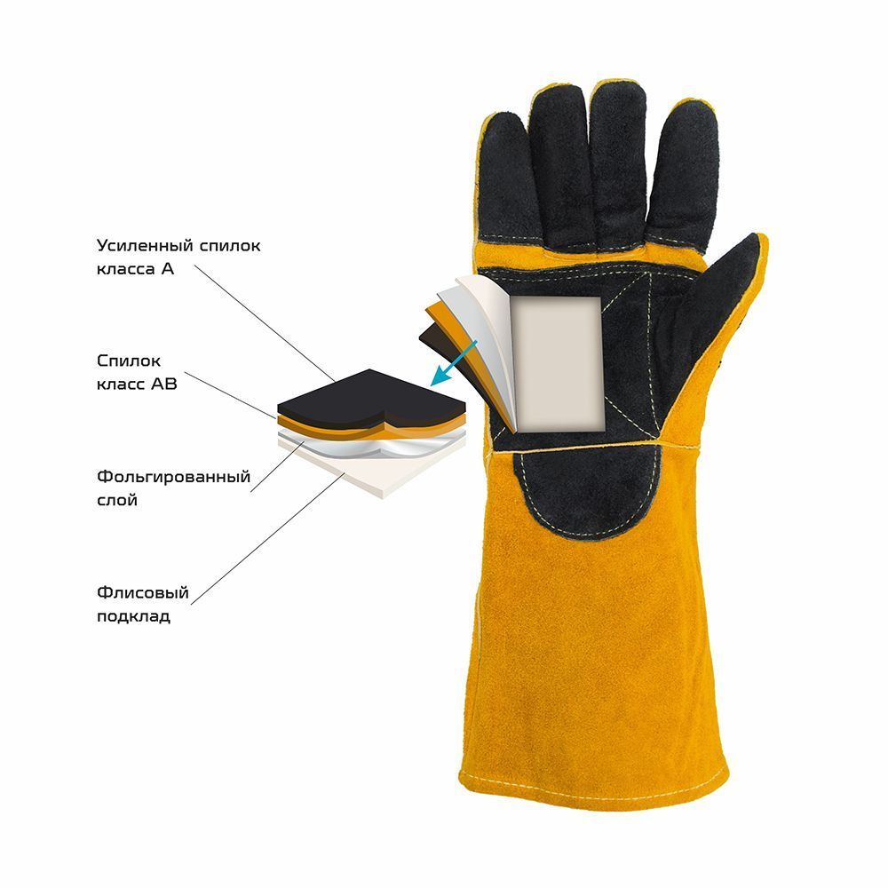 Краги сварщика спилковые пятипалые Оберон Титан изготовлены из лучшего кожевенного спилка (спилок A 1,2 мм) и обеспечивают максимальную жаростойкость при работе с высокими температурами, а также защиту от искр и раскалённых брызг металла. Краги изготовлены с использованием четырех материалов - усиленный спилок класса A, спилок класса AB, фольгированный слой и флисовый подклад, что обеспечивает максимальную защиту и превосходную теплоизоляцию. Полностью прошиты огнеупорной кевларовой нитью, что предотвращает выгорание швов. Также для этой цели используются дополнительные спилковые вставки. Усиленный наладонник во всю ширину ладони, усиленные пальцы, усиленная тыльная сторона обеспечивает дополнительную защиту, они прошиты двойной строчкой для большей прочности. Удлинённая манжета 20 см дополнительно защищает запястья и предплечья рук.