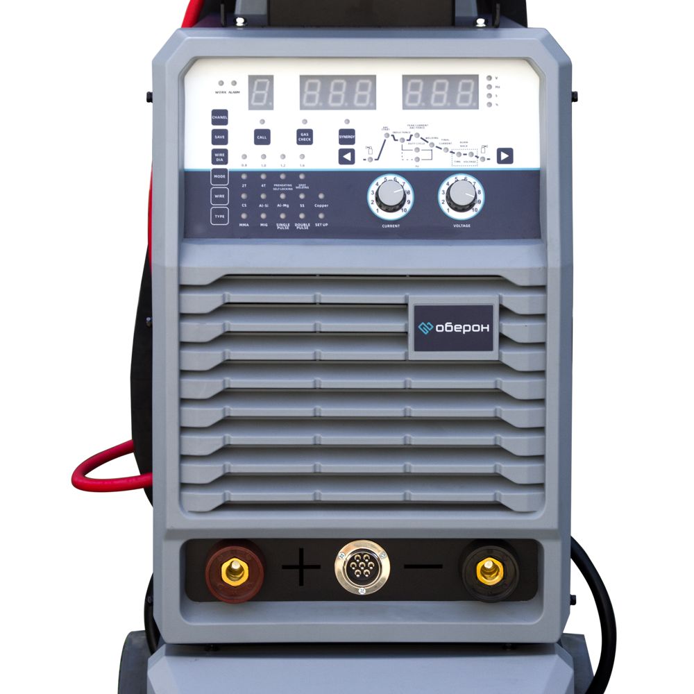 Сварочный инверторный аппарат Оберон MIG 500 Pulse представляет собой высокопроизводительное многофункциональное оборудование, способное обеспечить сварку в нескольких режимах: стандартном MIG/MAG, импульсном режиме, режиме двойного импульса, ручной сварки MMA. Особенности: Режим двойного импульса позволяет с легкостью и особым качеством сваривать нержавеющую сталь, алюминиевые сплавы и изделия из тонколистового металла. Функция синергетического управления позволяет выбирать оптимальные параметры сварочного тока, при этом корректировка сварочного напряжения (длины дуги) происходит автоматически. Возможность сохранения настроенных режимов сварки под определенные задачи в ячейки памяти дают возможность просто и быстро переключаться между режимами при замене материалов. Полная циклогамма позволяет производить точную настройку сварочного процесса, что обеспечивает максимальное качество сварки и сводит к минимуму потребность в последующей обработке. Подающий механизм выносного типа позволяет увеличить производительность и сократить время работы сварщика. 2Т/4Т режимы работы сварочной горелки для сварки коротких или длинных швов. Подходит для сварки углеродистой стали, алюминия, кремния, магния, нержавеющей стали, меди и других материалов проволокой диаметром от 0,8 до 1,6 мм. Стандартная комплектация: Сварочный аппарат - 1; Выносной подающий механизм - 1; Инструкция по эксплуатации - 1; Сварочная горелка MW-501 3м - 1; Кабель управления 5м - 1; Блок водяного охлаждения - 1; Тележка - 1.