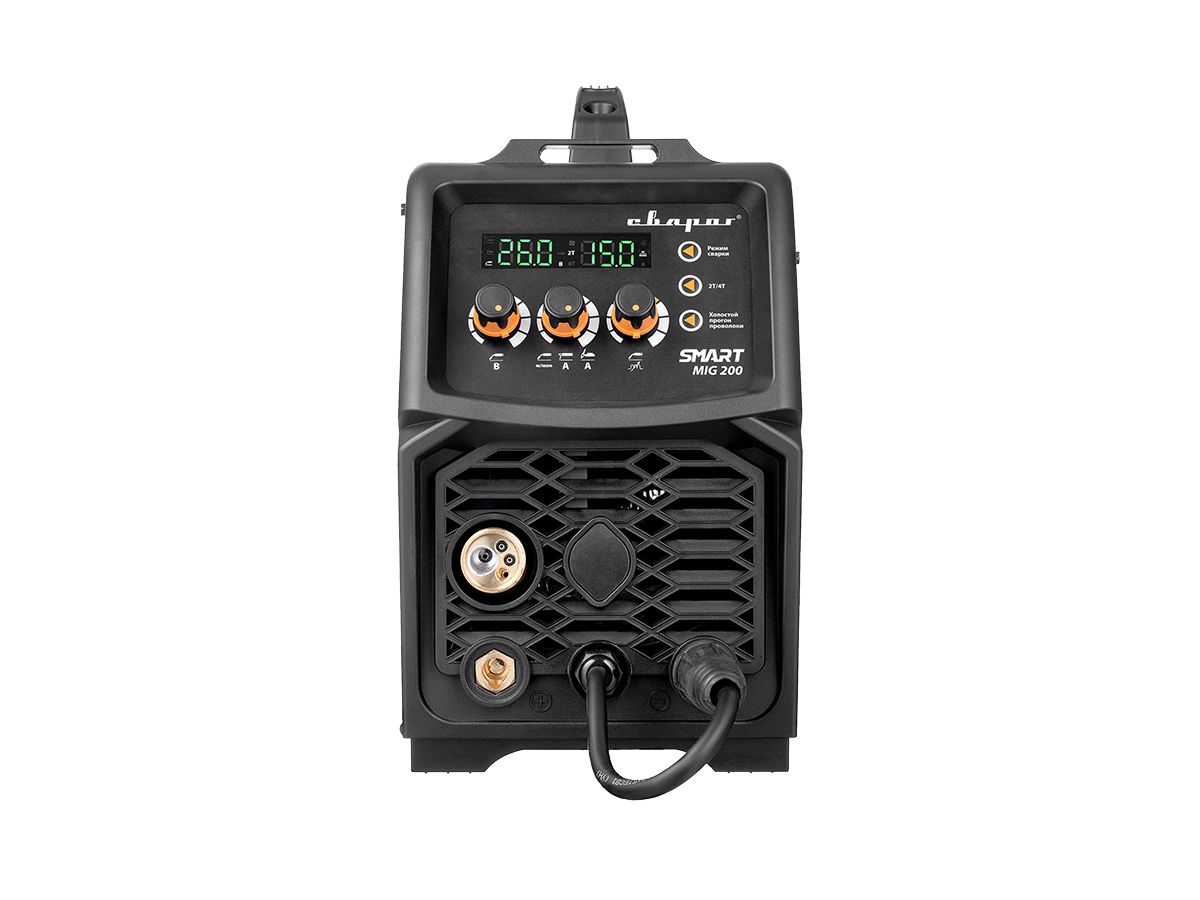 REAL SMART MIG 200 (N2A5) — универсальный, многофункциональный аппарат, предназначенный для полуавтоматической сварки сплошными и порошковыми проволоками (MIG/MAG), для ручной дуговой сварки покрытыми электродами (MMA), а также аргонодуговой сварки неплавящимся электродом (TIG). Все режимы являются полноценными и каждый содержит большой набор вспомогательных функций: